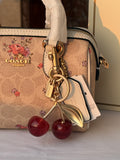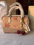 Elevate your everyday style with this striking Coach bag in warm light brown, adorned with an intricate flower pattern that commands attention. The cherry charm accent adds a bold pop of personality, making this piece a fearless fashion statement. Crafted with Coach's signature quality, this bag seamlessly transitions from day to night, proving that luxury doesn't have to play it safe. Perfect for those who dare to stand out and refuse to blend in.