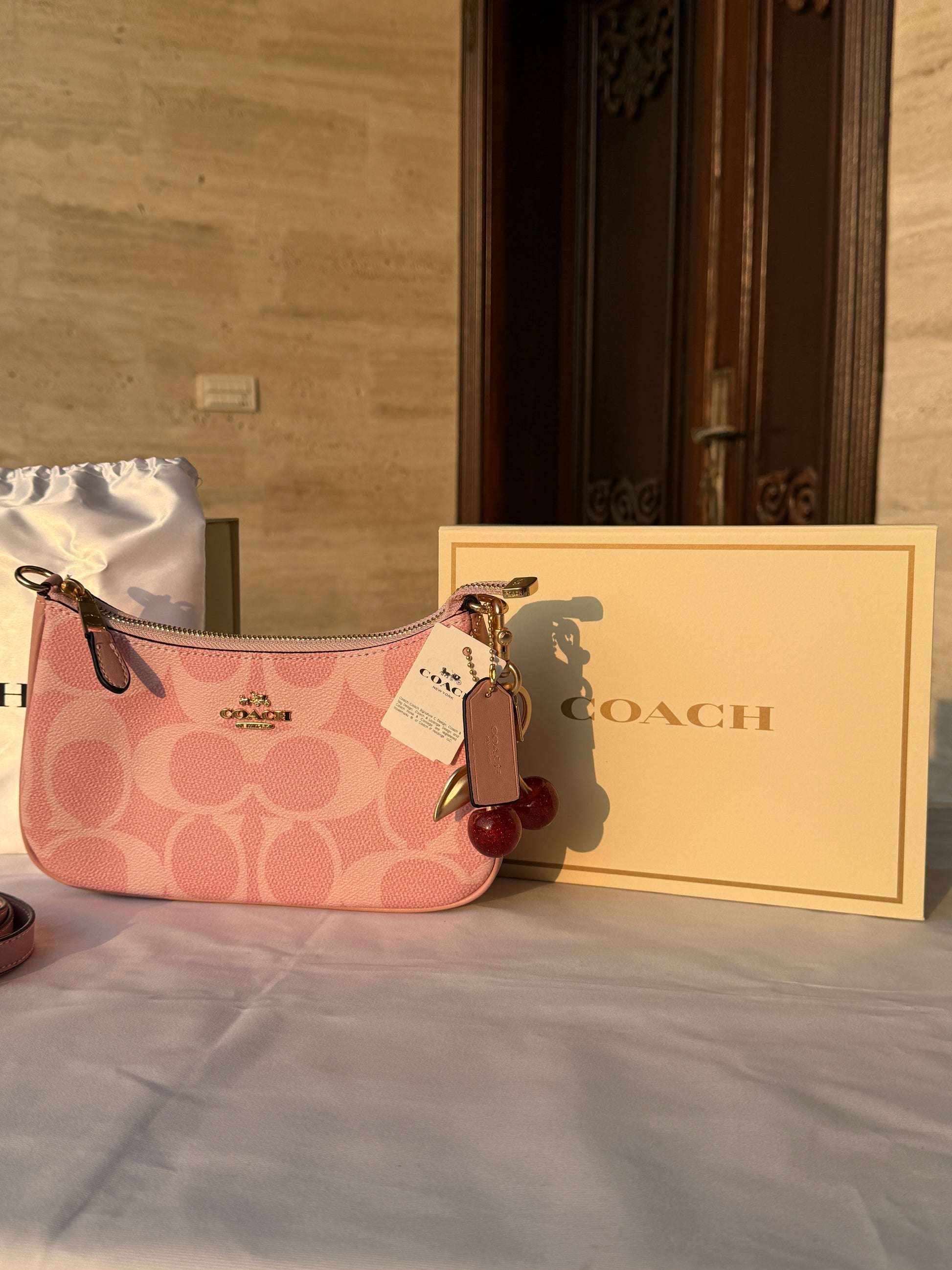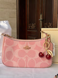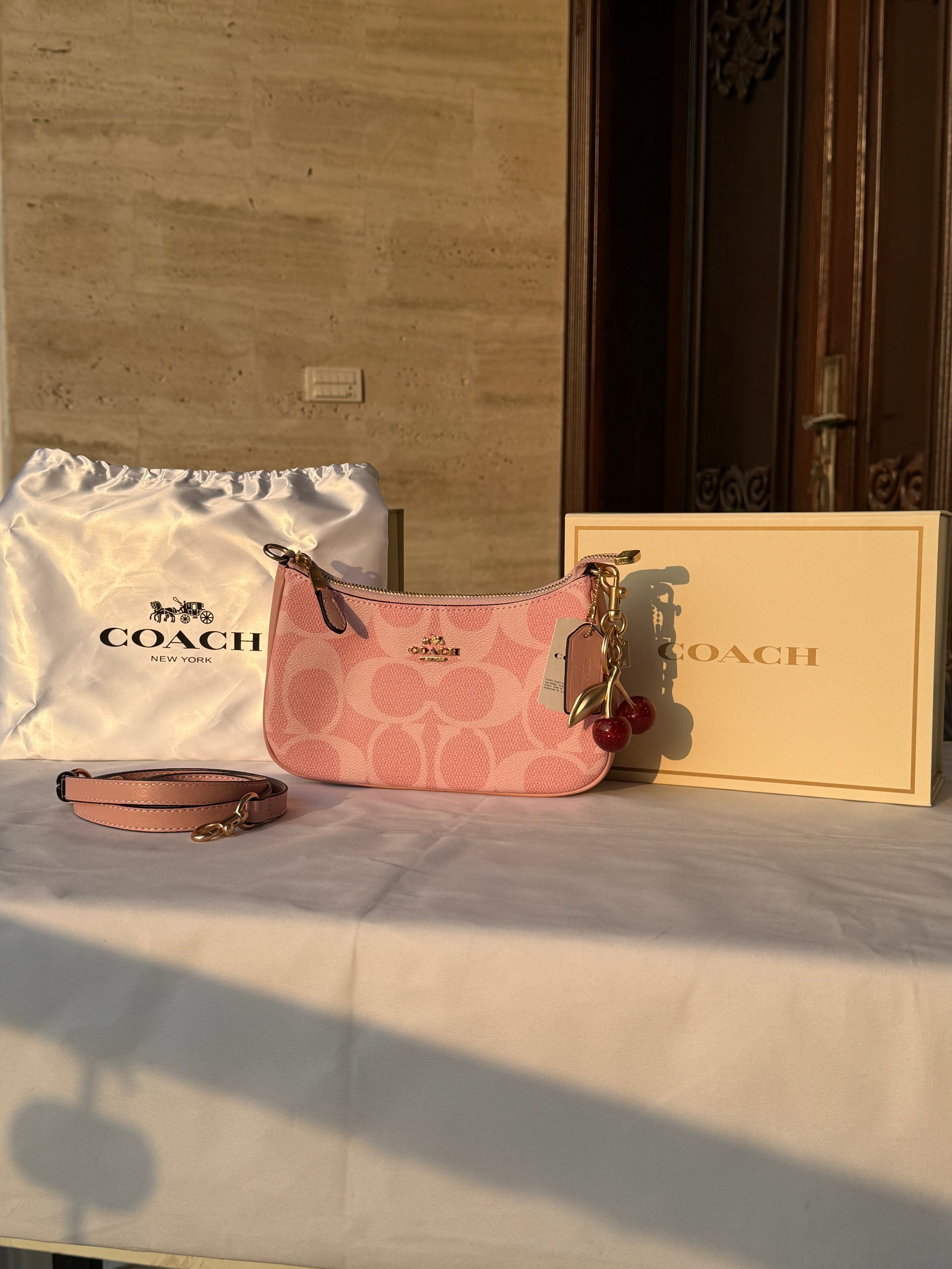 Elevate your everyday with this audacious Coach pink bag, a statement piece that refuses to blend in. The vibrant hue commands attention while the playful cherry charm adds an unexpected twist of personality. Crafted with Coach's signature quality, this bag balances bold aesthetics with practical functionality. Perfect for those who dare to stand out and aren't afraid to make their accessories do the talking. Carry confidence in every step.