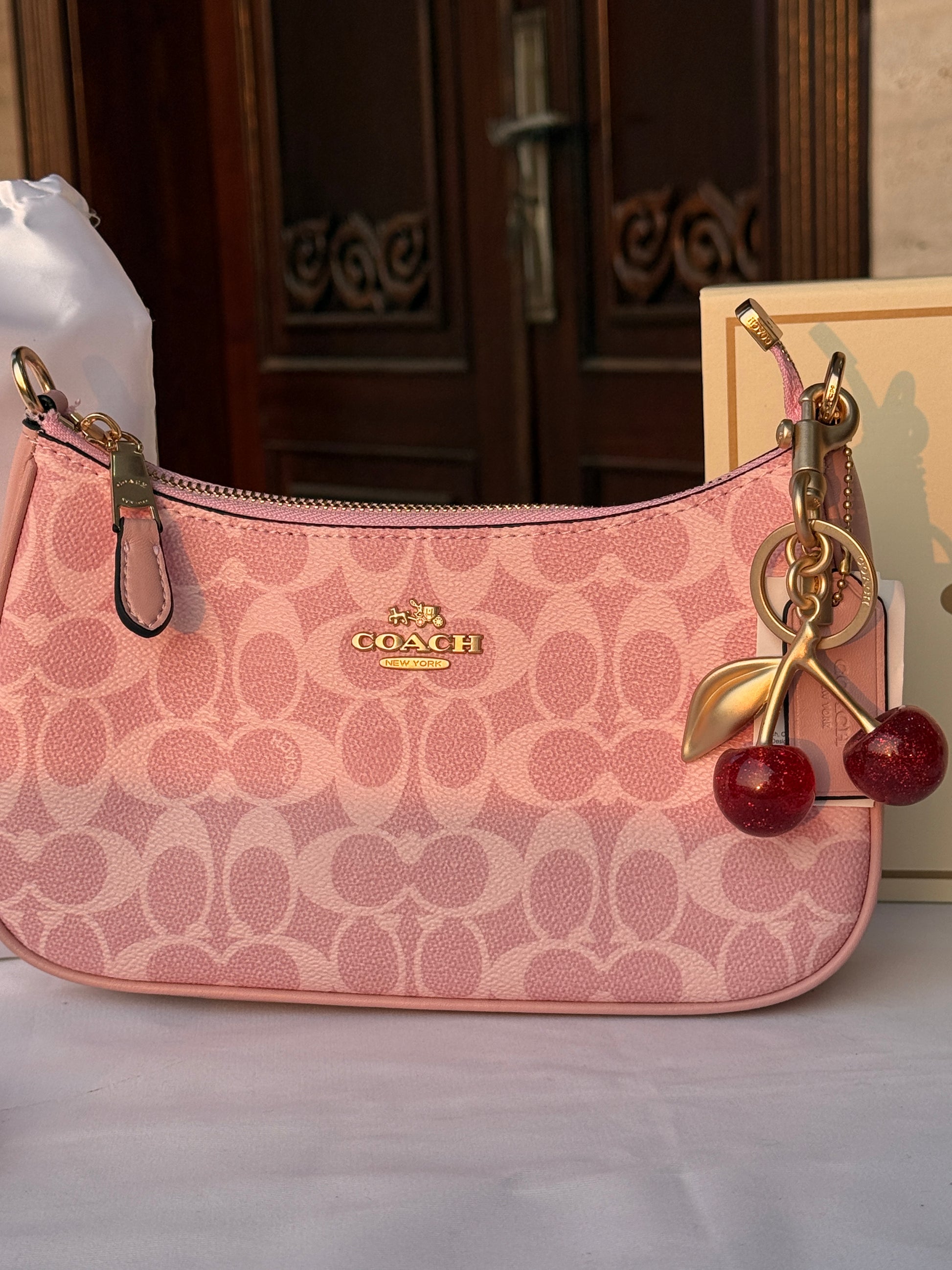 Unleash your bold side with this audacious Coach piece featuring a striking pink base that commands attention. The printed back design delivers an unexpected visual punch, while two cherry-red strips add a rebellious edge that refuses to blend in. Perfect for those who dare to stand out and make a statement. This isn't just an accessory—it's a declaration of confidence and style that turns heads wherever you go.
