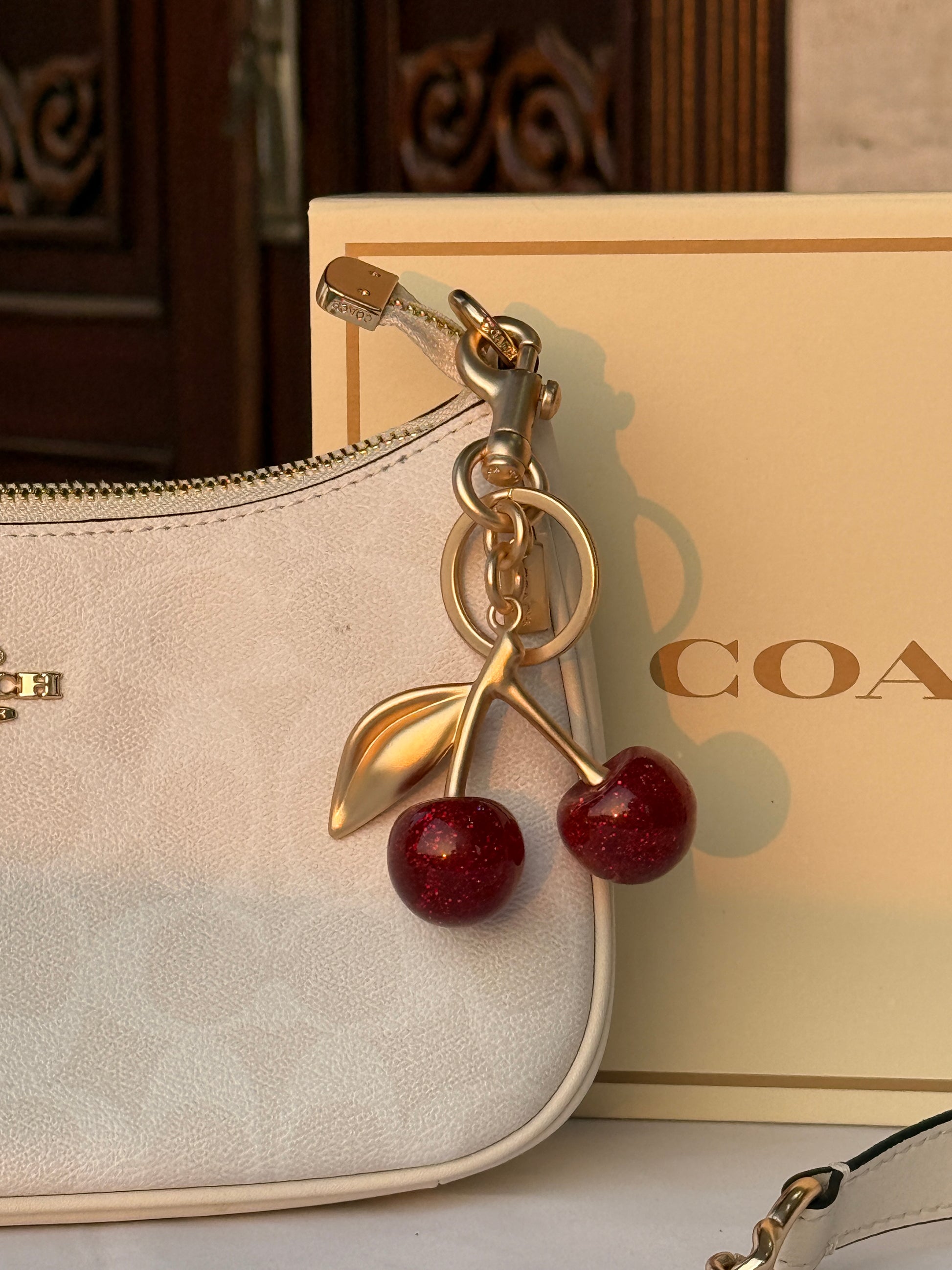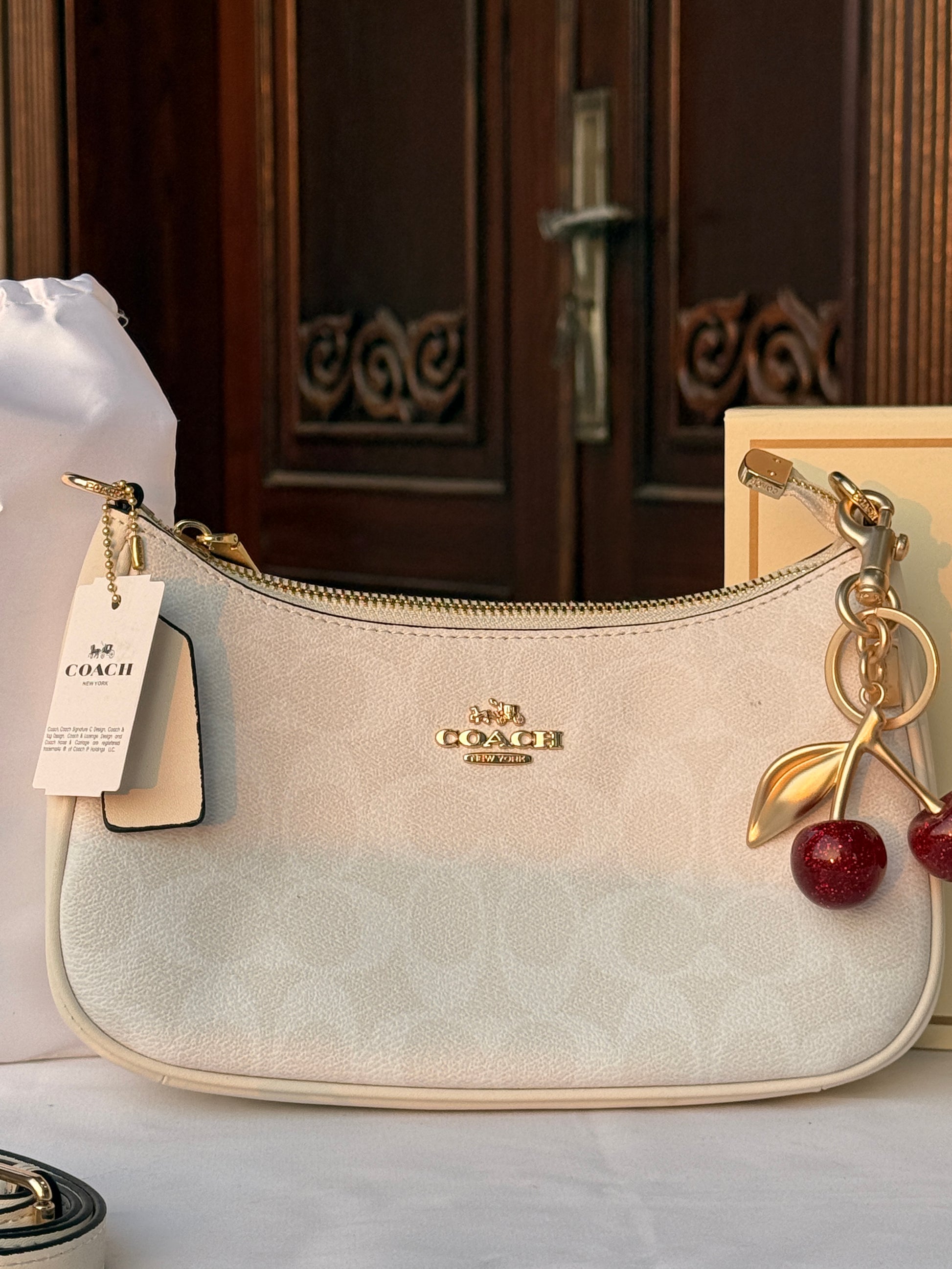 Elevate your everyday style with this striking Coach white pattern bag—a bold statement piece that refuses to blend in. The eye-catching cherry charm adds a playful pop of personality, while the dual strips provide structural edge and practical carrying versatility. Crafted with Coach's signature quality, this bag merges sophisticated design with daring flair, making it the perfect accessory for those who dare to stand out. Whether you're heading to the office or out for an adventure, this bag commands attention and delivers on both style and function.